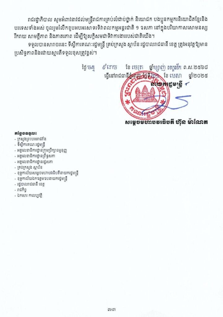 សារាចរ ស្តីពី ការរៀបចំខួបអនុស្សាវរីយ៍លើកទី១៣៩ នៃទិវាពលកម្មអន្តរជាតិ ថ្ងៃទី១ ខែឧសភា ឆ្នាំ២០២៥