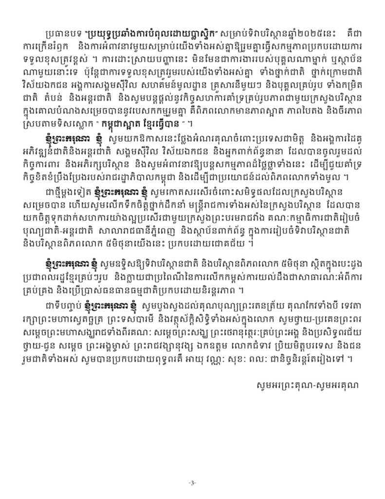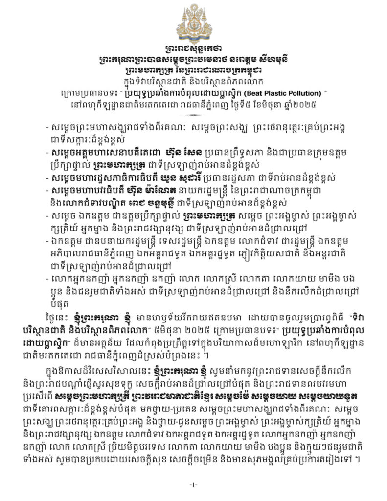 ព្រះរាជសុន្ទរកថាទាំងស្រុងរបស់ព្រះមហាក្សត្រ ក្នុងព្រះរាជពិធីទិវាបរិស្ថានជាតិ និងបរិស្ថានពិភពលោក ក្រោមប្រធានបទ៖ ប្រយុទ្ធប្រឆាំងការបំពុលដោយប្លាស្ទិក