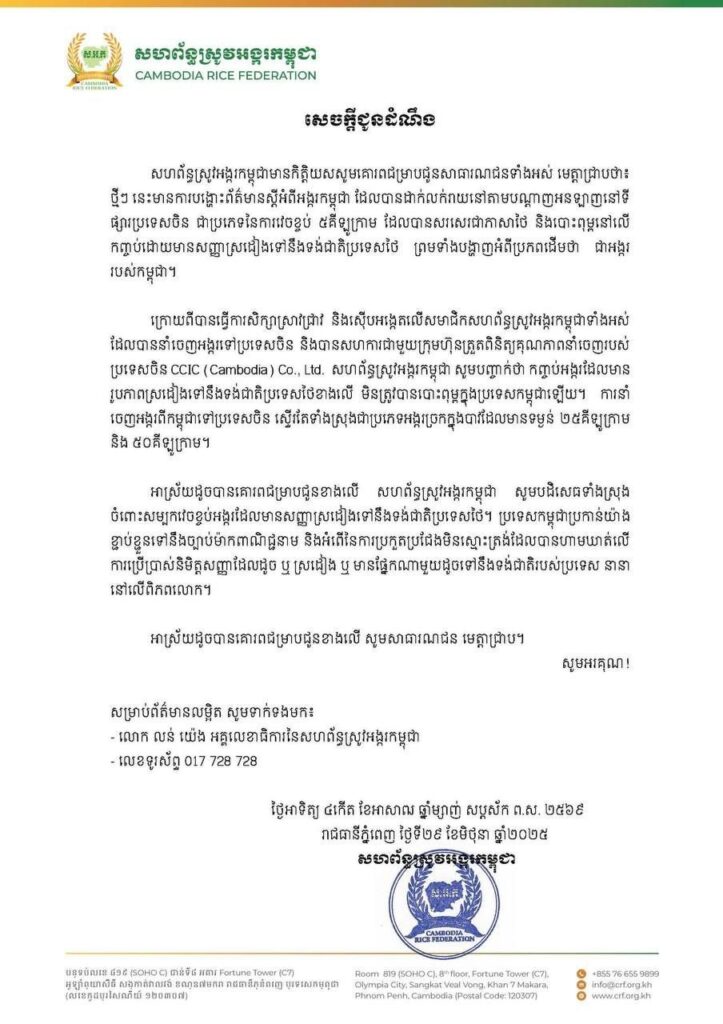 ភ្នំពេញ៖ សហព័ន្ធស្រូវអង្ករកម្ពុជា នៅថ្ងៃទី២៩ ខែមិថុនា ឆ្នាំ២០២៥នេះ ចេញសេចក្តីជូនដំណឹងមួយ ដោយបញ្ជាក់ឱ្យដឹងថា ថ្មីៗ នេះមានការបង្ហោះព័ត៌មាន ស្តីអំពីអង្ករកម្ពុជា ដែលបានដាក់លក់រាយនៅតាមបណ្តាញអនឡាញនៅទីផ្សារប្រទេសចិន ជាប្រភេទនៃការវេចខ្ចប់ ៥គីឡូក្រាម ដែលបានសរសេរជាភាសាថៃ និងបោះពុម្ពនៅលើកញ្ចប់ដោយមានសញ្ញាស្រដៀងទៅនឹងទង់ជាតិប្រទេសថៃ ព្រមទាំងបង្ហាញអំពីប្រភពដើមថា ជាអង្កររបស់កម្ពុជា។