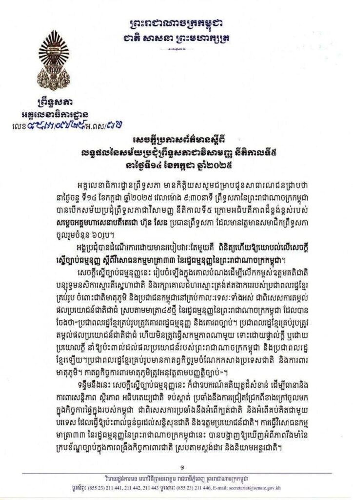 សេចក្តីប្រកាសព័ត៌មានស្តីពី លទ្ធផលនៃសម័យប្រជុំព្រឹទ្ធសភាជាវិសាមញ្ញ នីតិកាលទី៥នាថ្ងៃទី១៤ ខែកក្កដា ឆ្នាំ២០២៥ នៅវិមានព្រឹទ្ធសភា រាជធានីភ្នំពេញ