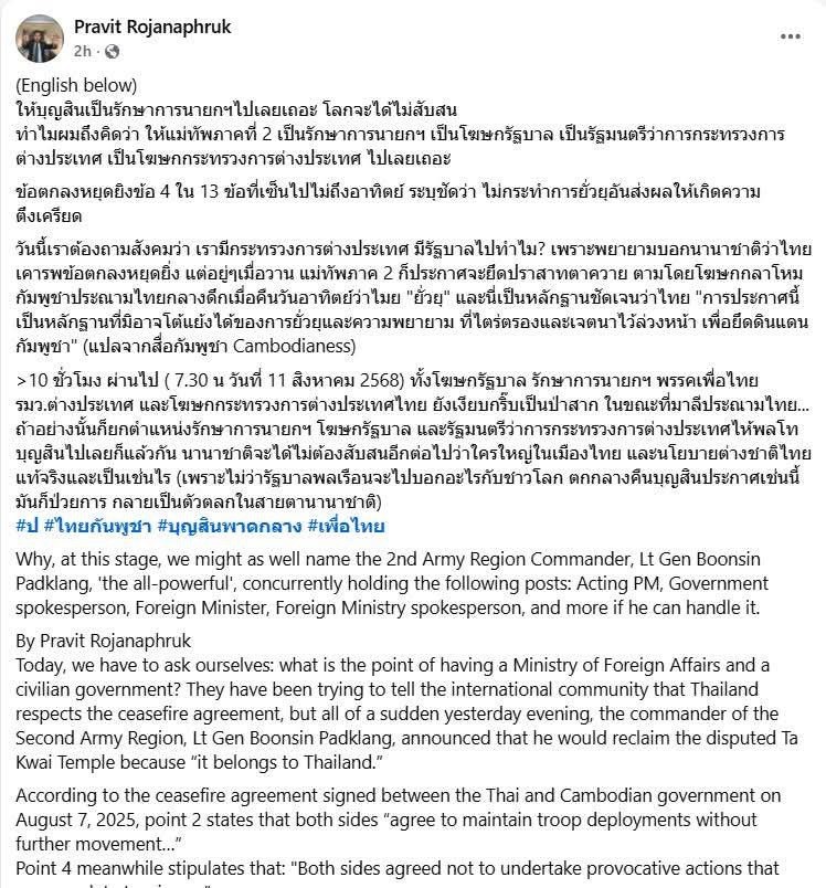 តាមលោក Pravit Rojanaphruk ថ្ងៃនេះ យើងត្រូវសួរខ្លួនឯងថា តើការមានក្រសួងការបរទេស និងរដ្ឋាភិបាលស៊ីវិលដើម្បីអ្វី? ថៃបានព្យាយាមប្រាប់សហគមន៍អន្តរជាតិថាប្រទេសថៃគោរពកិច្ចព្រមព្រៀងឈប់បាញ់គ្នា ប៉ុន្តែភ្លាមៗនោះកាលពីល្ងាចម្សិលមិញ មេបញ្ជាការនៃតំបន់កងទ័ពទី ២ គឺឧត្តមសេនីយ៍ទោ ប៊ុនស៊ីង ផាតក្លាង បានប្រកាសថាលោកនឹងទាមទារយកប្រាសាទតាក្របីមកវិញ។