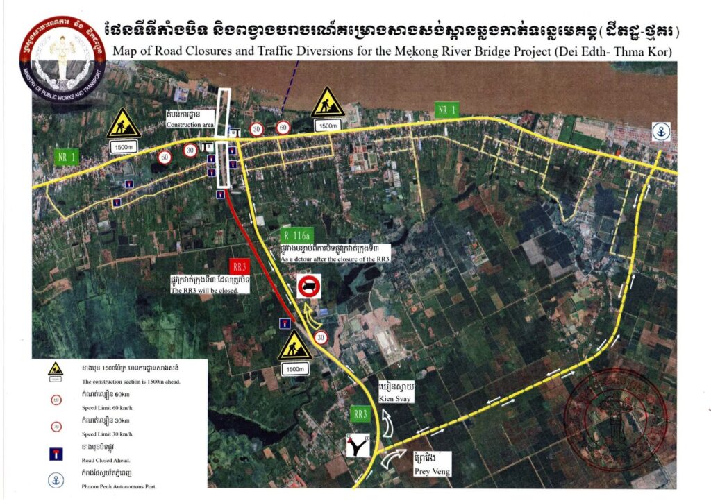 ក្រសួងសាធារណការ និងដឹកជញ្ជូន សូមជម្រាបជូនដំណឹងដល់សាធារណជន ប្រជាពលរដ្ឋ ប្រតិបត្តិករ និងក្រុមហ៊ុនដឹកជញ្ជូនទាំងអស់ដែលធ្វើដំណើរឆ្លងកាត់តាម មហាវិថី ស៊ី ជីនពីង (ផ្លូវក្រវាត់ក្រុងទី៣) ជ្រាបថា ក្រសួងសាធារណការ និងដឹកជញ្ជូន បាននិងកំពុងអនុវត្តគម្រោងសាងសង់ស្ពានឆ្លងកាត់ទន្លេមេគង្គ (ដីឥដ្ឋ-ថ្មគរ) មានទីតាំងផ្នែកខាងលិច នៅឃុំដីឥដ្ឋ ស្រុកកៀនស្វាយ និងខាងកើតស្ថិតនៅឃុំថ្មគរ ស្រុកល្វាឯម ខេត្តកណ្តាល។ ក្នុងអំឡុងពេលនៃការសាងសង់នេះ កំណាត់ផ្លូវមហាវិថី ស៊ី ជីនពីង ចាប់ពីផ្លូវបំបែកផ្លូវលេខ១១៦ A (គ.ម២+៨០០) ដល់ផ្លូវជាតិលេខ១ ត្រូវបានបិទជាបណ្តោះអាសន្ន ចាប់ពីថ្ងៃទី១ ខែកញ្ញា ឆ្នាំ២០២៥ វេលាម៉ោង០៧ព្រឹក តទៅរហូតដល់ ថ្ងៃទី១ ខែកុម្ភៈ ឆ្នាំ២០២៨។