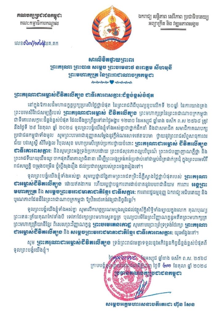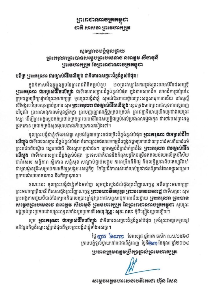 សម្តេចអគ្គមហាសេនាបតីតេជោ ហ៊ុន សែន ប្រធានព្រឹទ្ធសភានៃព្រះរាជាណាចក្រកម្ពុជា ប្រធានក្រុមឧត្តមប្រឹក្សាផ្ទាល់ព្រះមហាក្សត្រ និងជាប្រធានគណបក្សប្រជាជនកម្ពុជា គោរពថ្វាយព្រះពរ ព្រះករុណា ព្រះបាទ សម្តេចព្រះបរមនាថ នរោត្តម សីហមុនី ព្រះមហាក្សត្រនៃព្រះរាជាណាចក្រកម្ពុជា ក្នុងឱកាសដ៏មហានក្ខត្តឫក្សខួបលើកទី ២០ នៃការគ្រងរាជសម្បត្តិជាព្រះមហាក្សត្រនៃព្រះរាជាណាចក្រកម្ពុជា៕