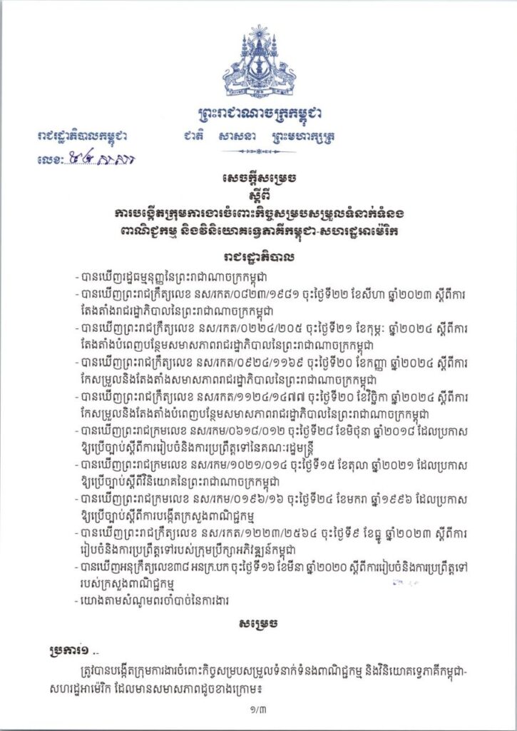 សេចក្តីសម្រេច ស្តីពី ការបង្កើតក្រុមការងារចំពោះកិច្ចសម្របសម្រួលទំនាក់ទំនង ពាណិជ្ជកម្ម និងវិនិយោគទ្វេភាគីកម្ពុជា-សហរដ្ឋអាម៉េរិក