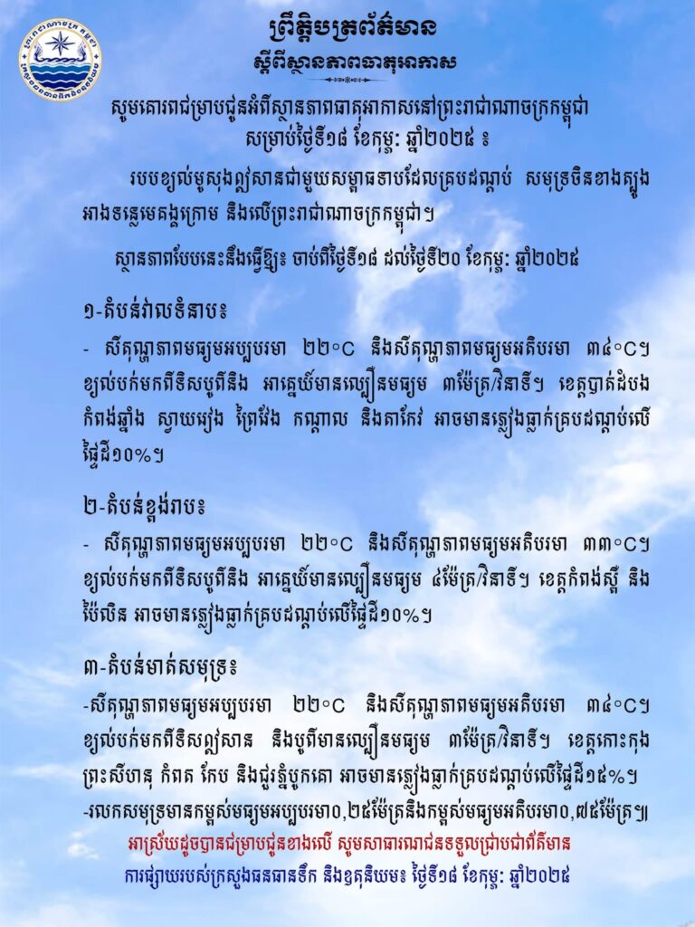 ស្ថានភាពធាតុអាកាសនៅព្រះរាជាណាចក្រកម្ពុជាសម្រាប់ថ្ងៃទី១៨ ខែកុម្ភៈ ឆ្នាំ២០២៥៖