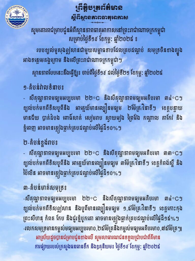សូមគោរពជម្រាបជូនអំពីស្ថានភាពធាតុអាកាសនៅព្រះរាជាណាចក្រកម្ពុជាសម្រាប់ថ្ងៃទី១៥ ខែកុម្ភៈ ឆ្នាំ២០២៥៖