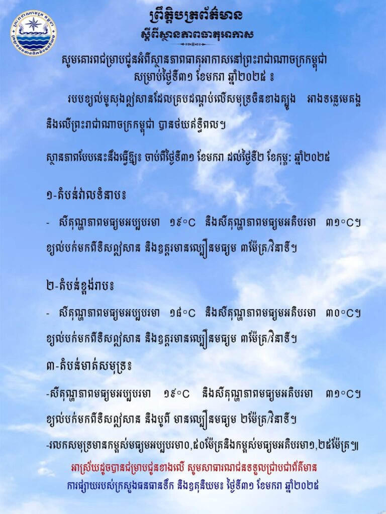 សូមគោរពជម្រាបជូនអំពីស្ថានភាពធាតុអាកាសនៅព្រះរាជាណាចក្រកម្ពុជាសម្រាប់ថ្ងៃទី៣១ ខែមករា ឆ្នាំ២០២៥