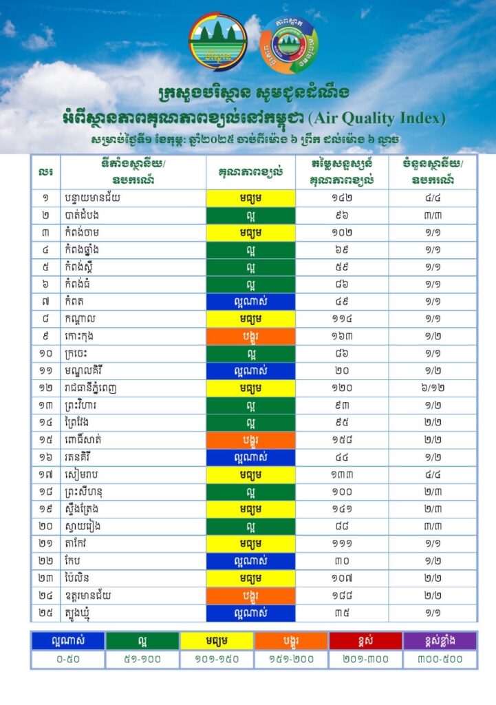 សេចក្ដីជូនដំណឹង៖ ក្រសួងបរិស្ថានសូមជូនដំណឹងអំពីស្ថានភាពគុណភាពខ្យល់នៅក្នុងព្រះរាជាណាចក្រកម្ពុជា សម្រាប់ថ្ងៃទី១ ខែកុម្ភៈ ឆ្នាំ២០២៥ ចាប់ពីម៉ោង ៦ ព្រឹក ដល់ម៉ោង ៦ ល្ងាច