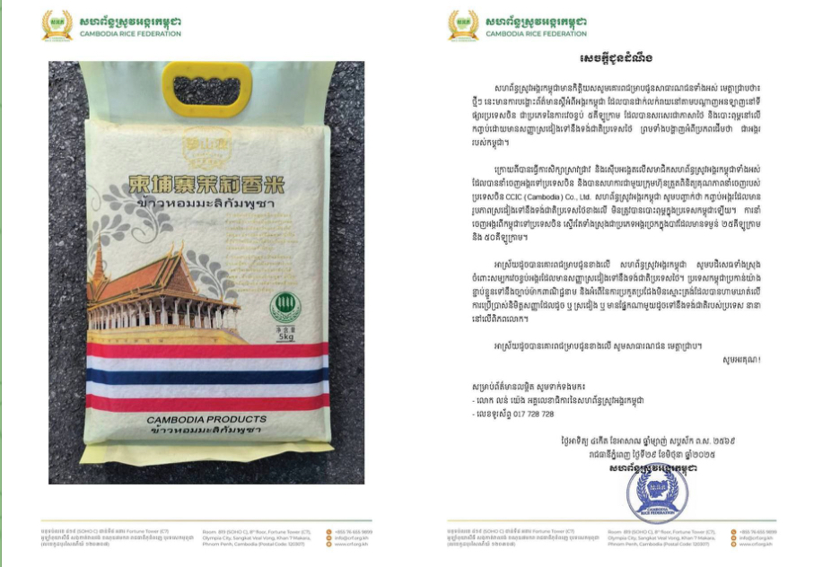 កម្ពុជាបដិសេធអង្ករកម្ពុជា ដែលបានដាក់លក់រាយនៅតាមបណ្តាញអនឡាញនៅទីផ្សារប្រទេសចិនមិនមែនជាផលិតផលអង្កររបស់ខ្មែរទេ