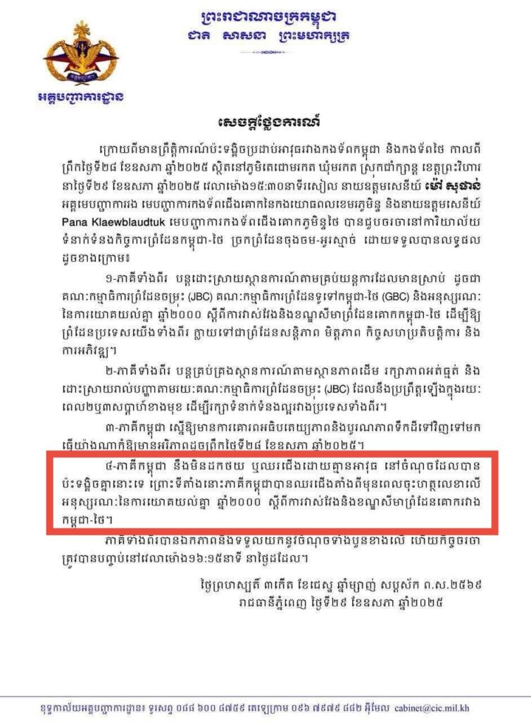 សេចក្តីថ្លែងការណ៍របស់ អគ្គបញ្ជាការដ្ឋាននៃកងយោធពលខេមរភូមិន្ទ ជុំវិញជំនួបចរចាររវាងកម្ពុជា-ថៃ ពាក់ព័ន្ធព្រឹត្តិការណ៍ប៉ះទង្គិចប្រដាប់អាវុធរវាងកងទ័ពប្រទេសទាំង២
